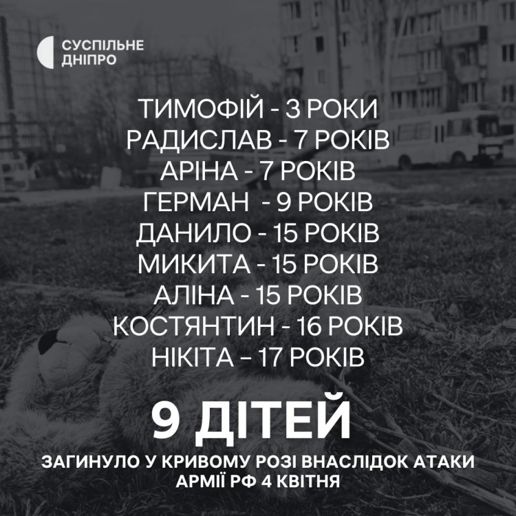 "Трирічний Тимофій, на жаль, помер сьогодні в лікарні. Семирічний Радислав. Аріна, якій назавжди теж 7 років. Дев’ятирічний Герман. П’ятнадцятирічний Данило. П’ятнадцятирічний Микита. П’ятнадцятирічна Аліна. Костянтин, якому назавжди 16 років. Нікіта – 17 років. Це діти, які були вбиті ударом російської балістичної ракети по Кривому Рогу. Було лише кілька хвилин після запуску з району Таганрога на території ворога", - повідомив Володимир Зеленський.