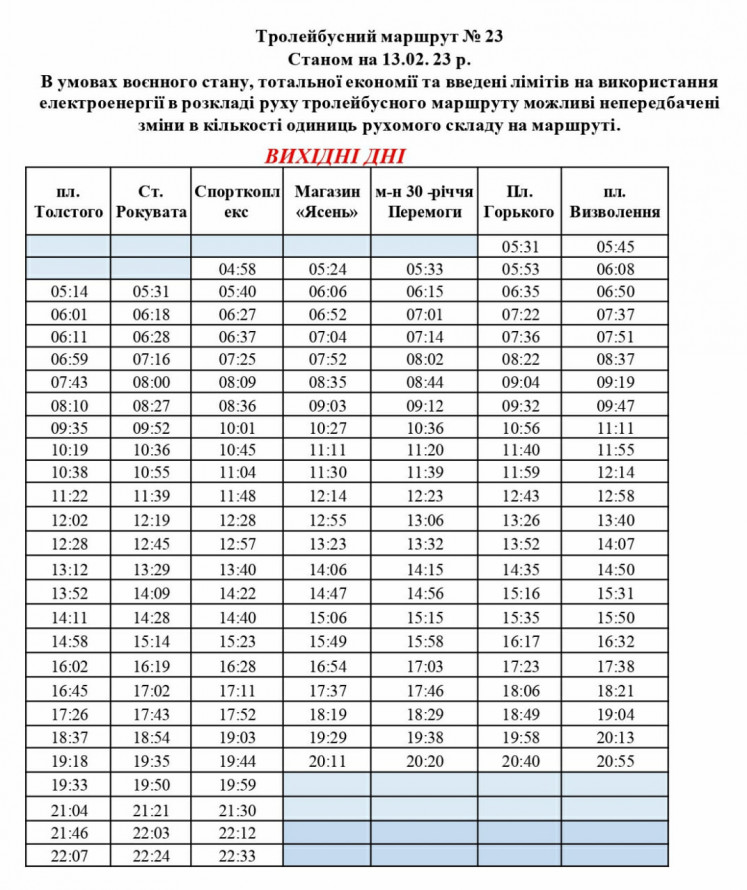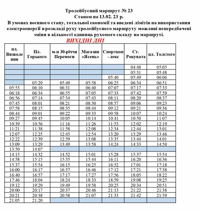 Протягом вихідних днів з площі Визволення можна виїхати о 05:53 першим рейсом та о 21:05 останнім рейсом. З площі Льва Толстого - о 05:14 та 22:07 відповідно.