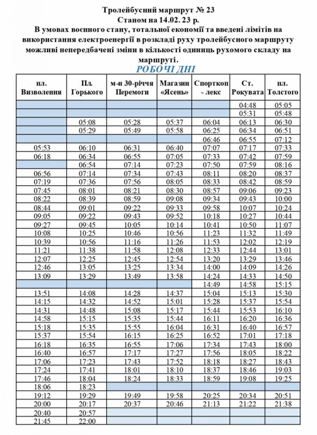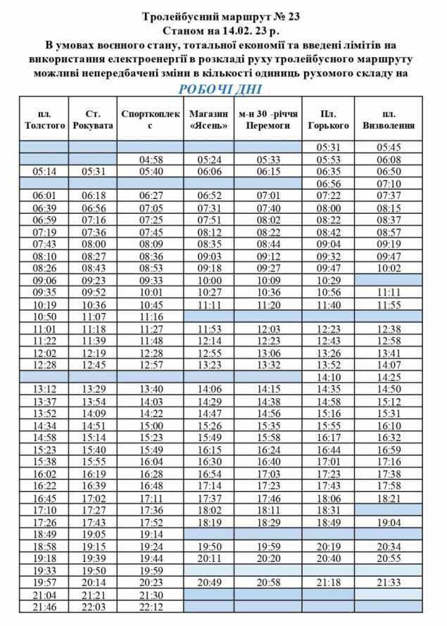 Протягом робочих днів перший рейс тролейбуса № 23 відправляється з площі Визволення о 05:53, останній - о 21:45. З площі Льва Толстого перший тролейбус виїжджає о 05:14, останній - о 21:46.