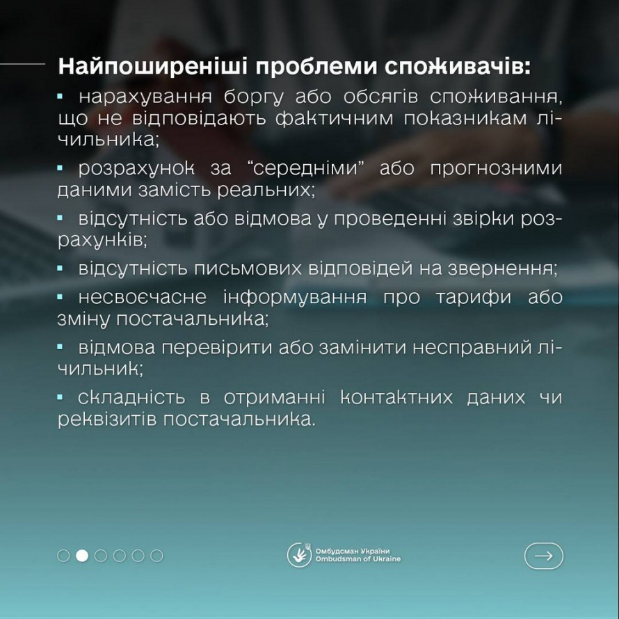 Серед найбільш частих випадків – неправильні розрахунки за спожиті ресурси, нарахування боргів, що не відповідають фактичним показникам, виставлення рахунків за "середніми" даними, а також відмова у звірці платежів. Деякі постачальники ігнорують письмові звернення або не надають інформації про тарифи та технічні перевірки лічильників.