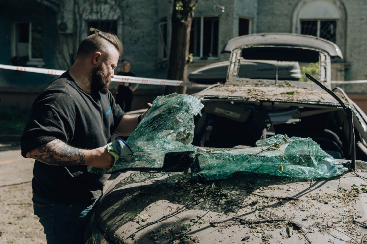 Кияни отримують плівку для тимчасового захисту осель, комунальні служби забивають фанерою вибиті вікна у підʼїздах. Пошкоджено щонайменше 25 будівель, включаючи школу та дитячий садок.