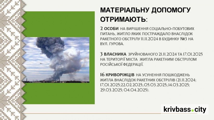 У межах червневих виплат також передбачені понад 2 мільйони для мешканців, чиє житло було зруйновано або пошкоджено внаслідок ракетних атак. Йдеться, зокрема, про обстріли у листопаді 2024 року, а також у січні, лютому, березні та квітні 2025-го.