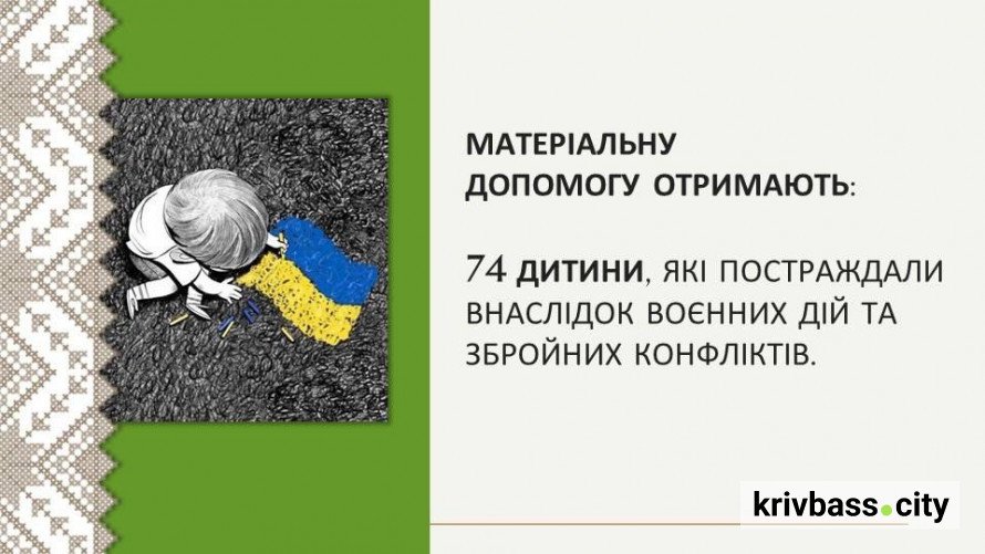 Кривий Ріг залишається першим містом в Україні, в якому запроваджені виплати дітям зі статусом «постраждалих внаслідок воєнних дій та збройних конфліктів». У червні таку допомогу в розмірі 5 тисяч отримають 74 дитини. З початку року — 165 дітей.