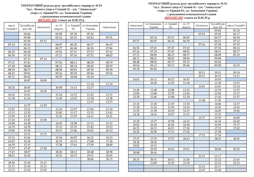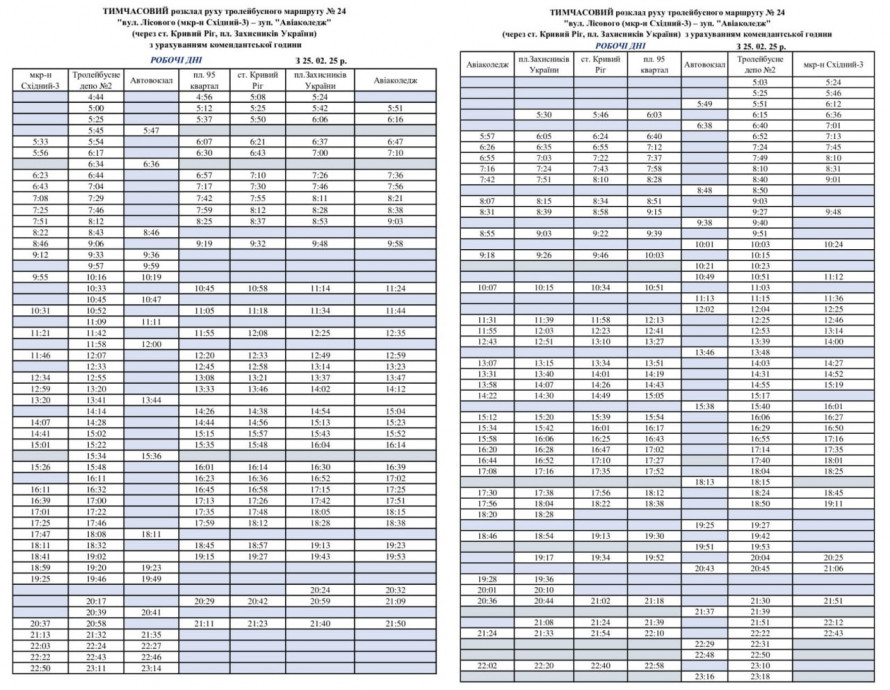 У спільноті “Транспорт Кривого Рогу” опублікували оновлений розклад тролейбусного маршруту №24 зі Східного-3 в напрямку Авіаколеджу.
