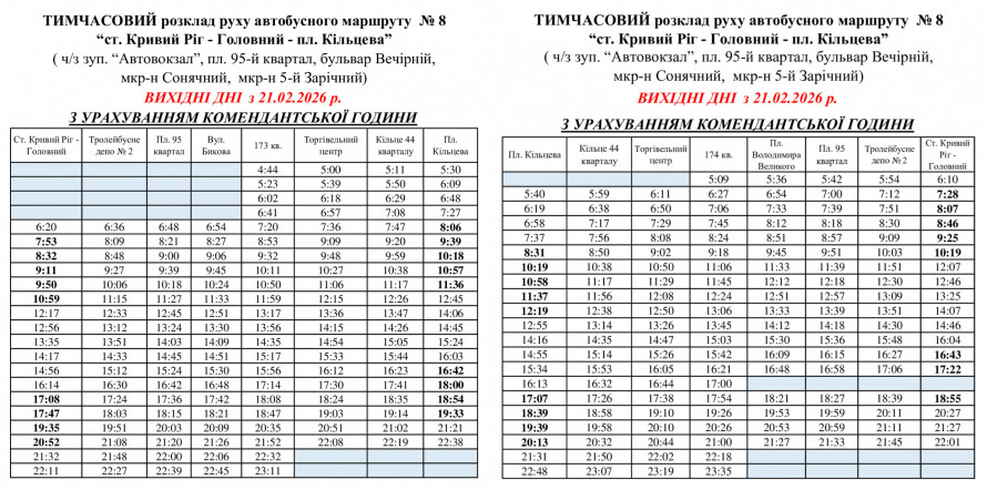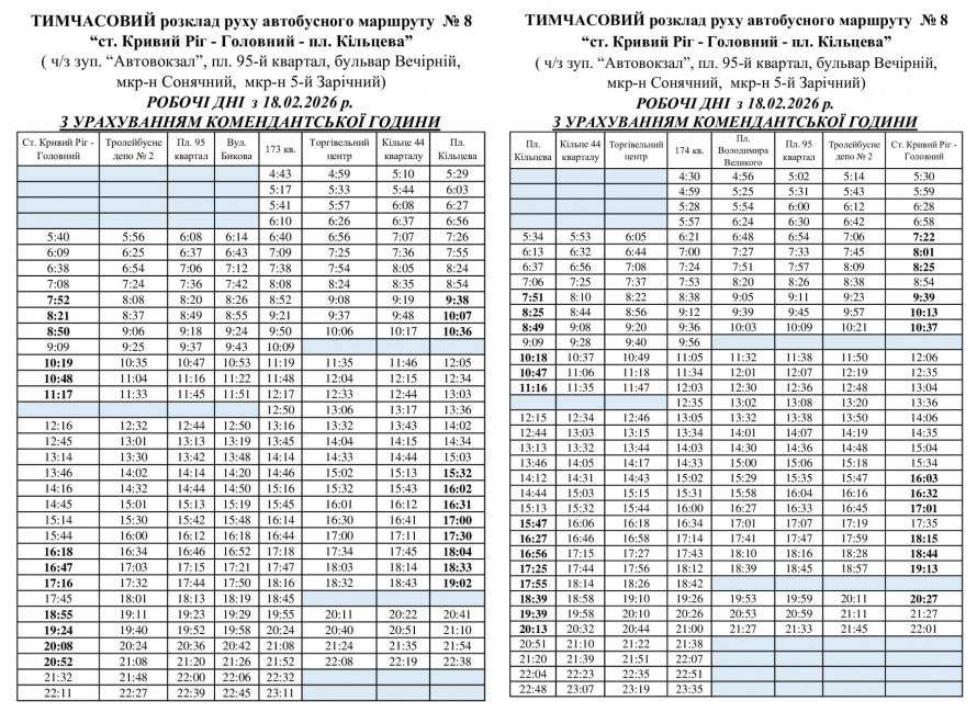 Після вивчення пасажиропотоку на одному вечірньому рейсі маршруту №8, яке відбувалося з 18.02.2026 по 03.03.2026 внесли зміни у розкладі руху на постійній основі з часом відправлення з площі "Кільцева" о 19:39 в робочі та вихідні та з кінцевої «станція Кривий Ріг-Головний» о 21:32 до 173 кварталу.