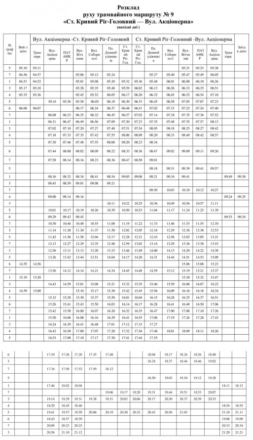 Розклад руху трамвайного маршруту №9 у Кривому Розі