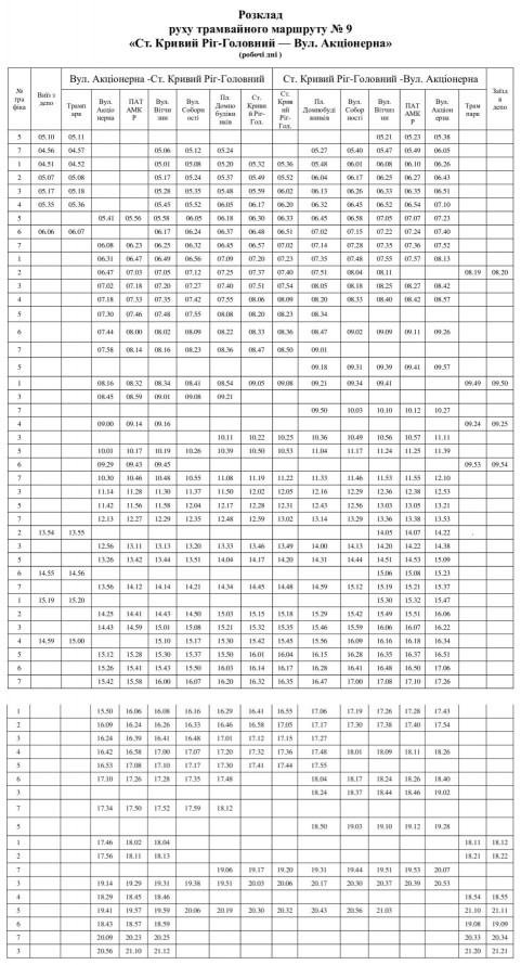 Розклад руху трамвайного маршруту №9 у робочі дні - фото "Транспорт Кривого Рогу"