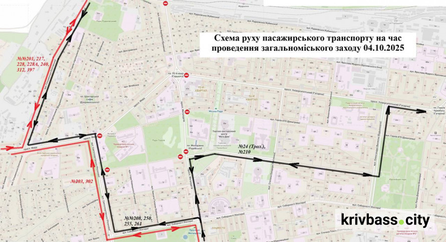• автобуси №201, 203, 217, 228, 240, 302, 312, 397 та інші – об’їзд перекритих ділянок через вул. Святогеоргіївську, Соборності, Гетьманську, Дарвіна та Вільної Ічкерії;