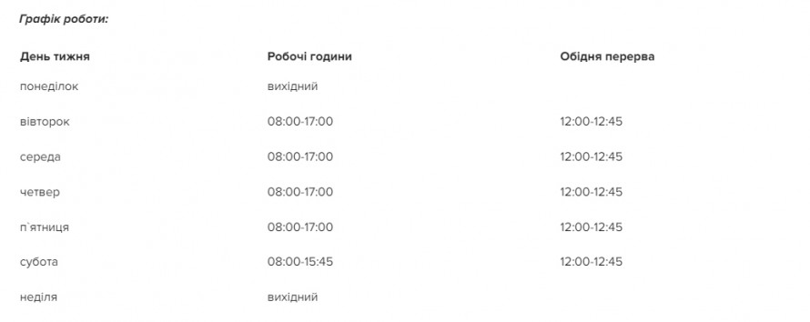 Щодня (вівторок,середа,четвер,п`ятниця) з 8:00 до 17:00, у суботу з 8:00 до 15:45. Вихідний: понеділок, неділя.