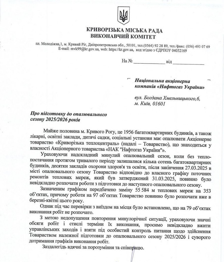 Міська влада Кривого Рогу надіслала офіційний лист до НАК «Нафтогаз України» та Міністерства розвитку громад і територій. Причина — грубі порушення графіка ремонтних робіт на об’єктах державної компанії АТ «Криворізька теплоцентраль», що ставить під загрозу підготовку підпорядкованої Нафтогазу кампанії до опалювального сезону 2025/2026 рр.