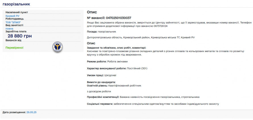 Фахівці по роботі з кадрами криворізького підприємства ТОВ "ЗЛМЗ" запрошують пошукачів роботи працевлаштуватися на посаду газорізальника.