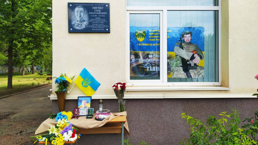 На фасаді Криворізької спеціалізованої школи «Натхнення» відкрили меморіальну дошку на честь випускника закладу — Овечка Тараса, який віддав своє життя, захищаючи Україну від військової агресії.