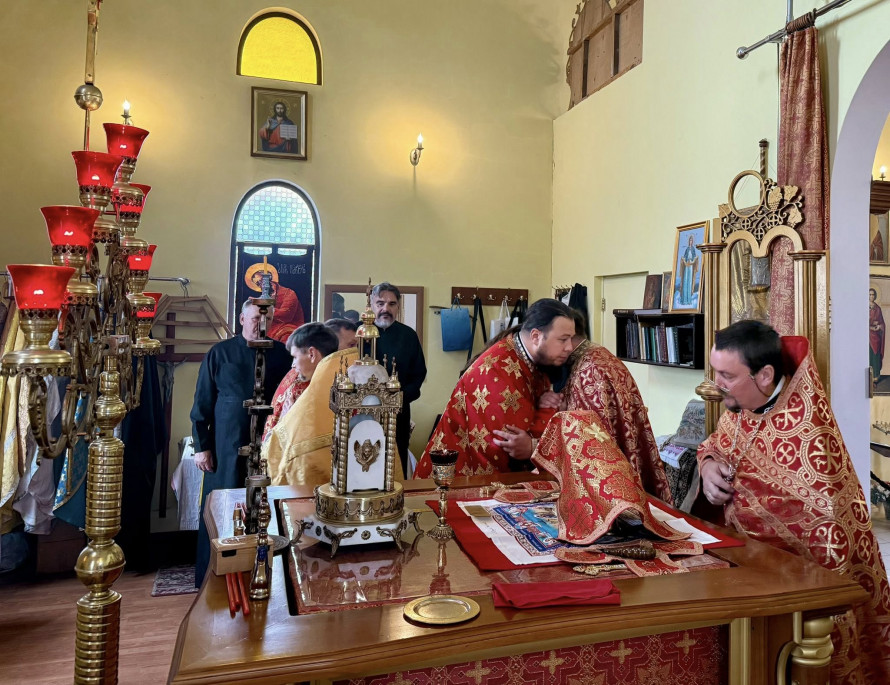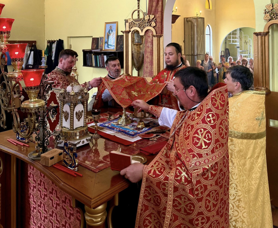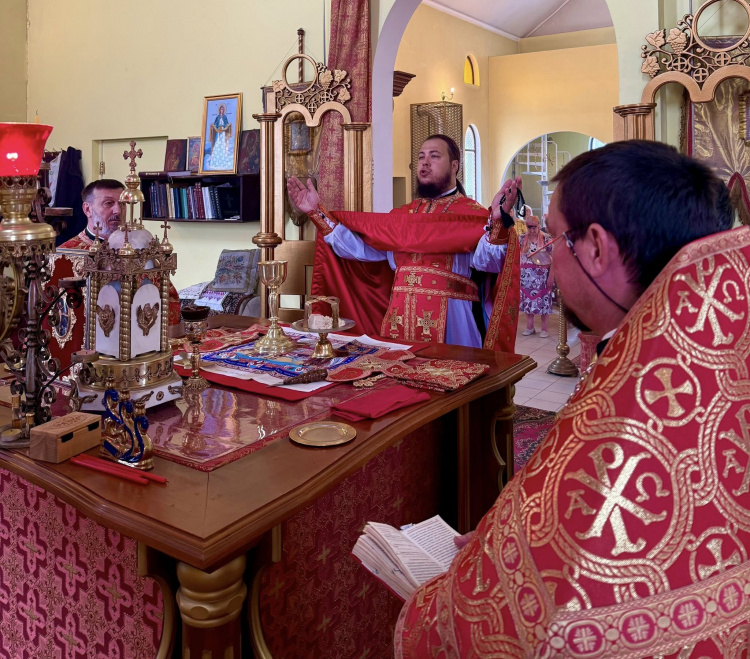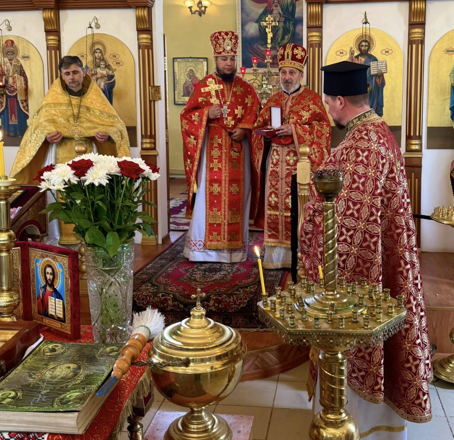 Відслуживши Літургію разом з собором духовенства Кривого Рогу, архімандрит Меркурій від імені високопреосвященного владики Симеона та від імені усієї повноти Дніпровської єпархії ПЦУ привітав з престольним днем усіх парафіян та вручив з нагоди свята отцю Святославу на знак їх давньої, вже більш як 20-літньої духовної дружби свій особистий подарунок – священицький срібний хрест з прикрасами із Святим Образом Розп’яття Господа Бога і Спаса нашого Ісуса Христа.