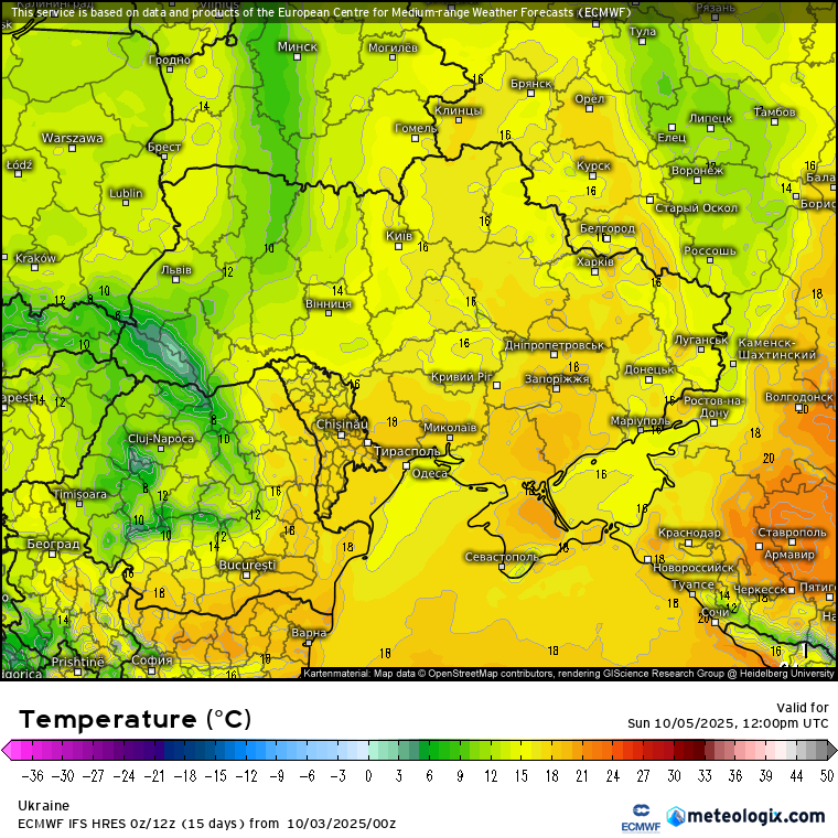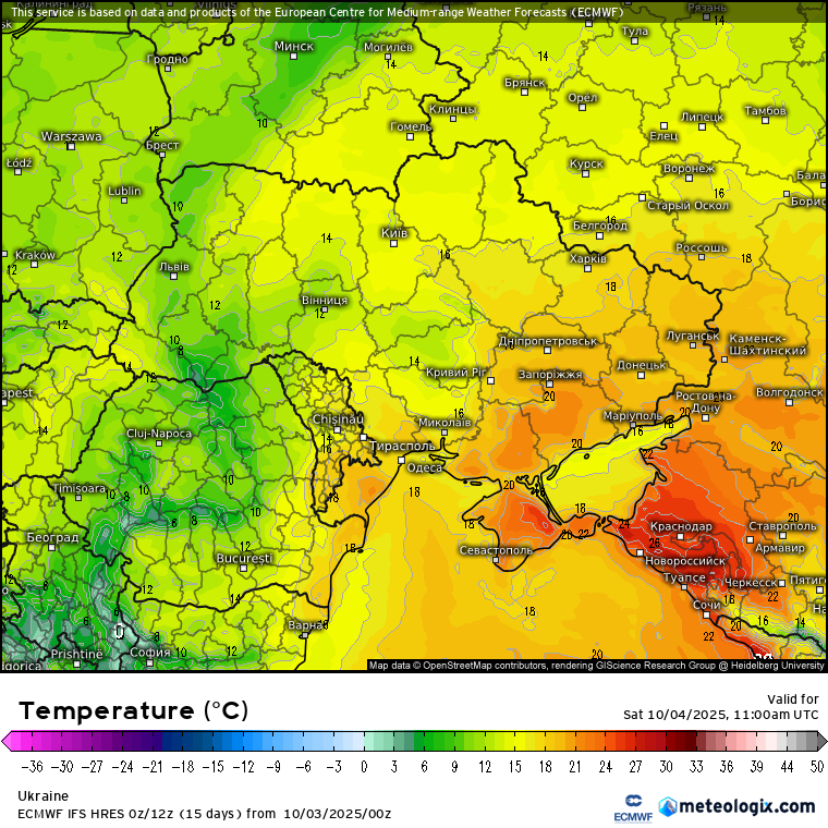 В південній половині країни, а також у Криму прогнозується спокійна ніч, без істотних опадів (окрім півдня Одещини). Вранці та вдень небо потемніє дощами з грозами, місцями можливі зливи. У Криму — здебільшого сухо. Вітер південно-східний, 5–10 м/с. Температура вночі +10…+16 °С, вдень +17…+22 °С.