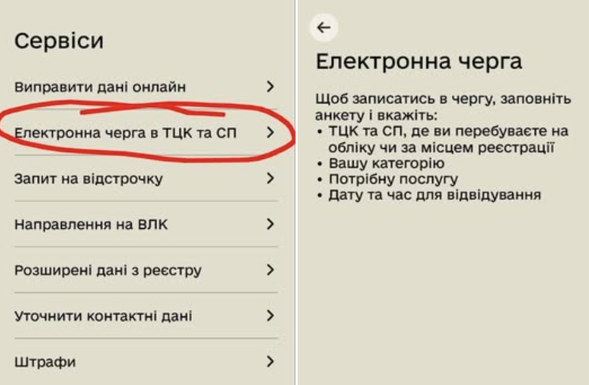 2. У розділі "Сервіси" обрати пункт "Електронна черга в ТЦК та СП";