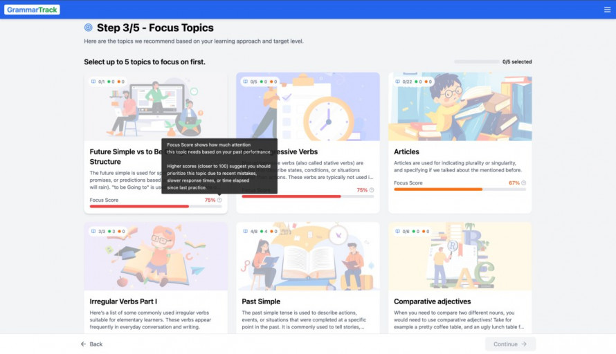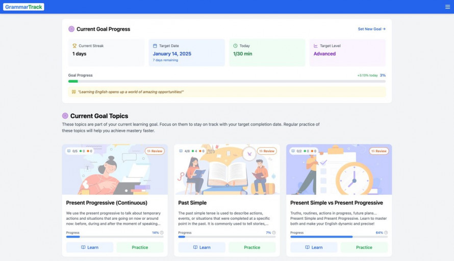 - Learn New Topics — головний фокус на опануванні нового матеріалу. Користувач може обрати до п’яти нових граматичних тем та вивчати їх у комфортному темпі в межах своєї цілі.