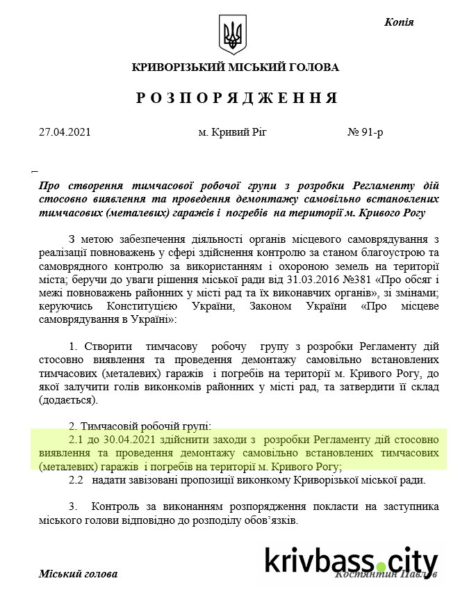В Кривом Роге принялись за разработку Регламента действий касательно выявления и проведения демонтажа самовольно установленных временных (металлических) гаражей и погребов. Соответствующие распоряжение завизировал Криворожский городской голова 27 апреля 2021 года.