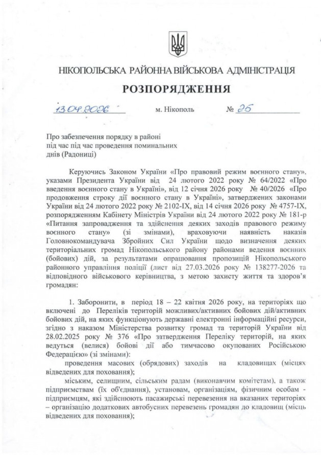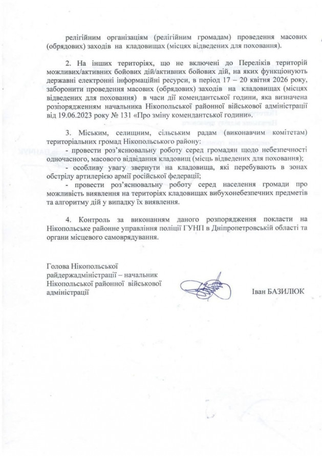 Масові заходи на кладовищах заборонили проводити на територіях, де тривають або можливі бойові дії. Водночас на інших територіях району діятимуть обмеження під час комендантської години.
