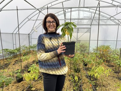 Олена Гож показує вирощений у своєй теплиці гострий перець - фото Суспільне Дніпро