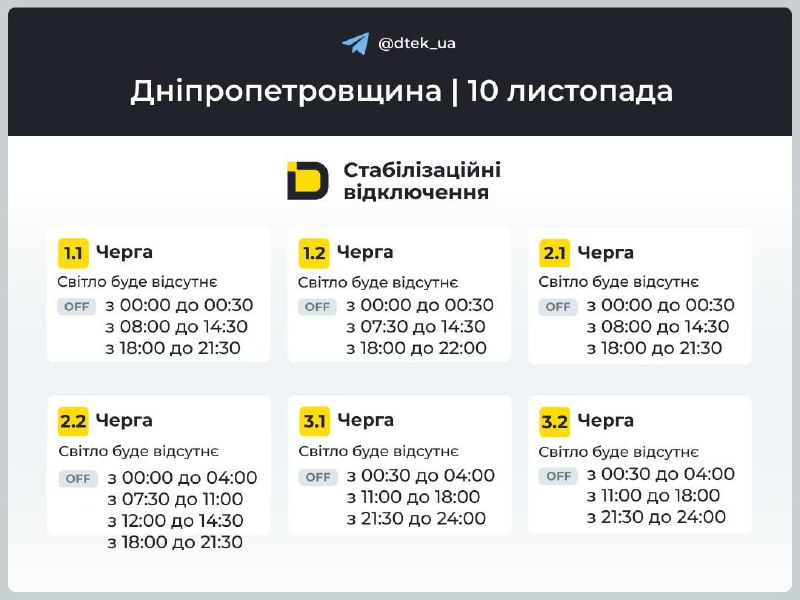 На Дніпропетровщині, за інформацією фахівців ДТЕК, для побутових споживачів застосовуються графіки стабілізаційних відключень світла.