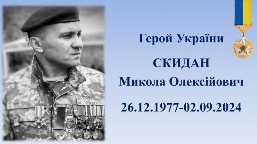 Скидану Миколі Олексійовичу, старшому лейтенанту, з 2014 року виконував бойові завдання на сході України, брав участь у боях на Херсонському та Сумському напрямках, у наступальній операції Сил оборони України під селом Старомайорським Донецької області. У липні 2024 року розвідувальний підрозділ під командуванням Миколи Олексійовича біля селища Лозуватського Донецької області здійснив дорозвідку, установивши реальне положення переднього краю ворожих сил, та, зачистивши ворожі окопи, завів на визначені позиції бійців механізованого батальйону. Біля селища Гродівки Донецької області, отримавши інформацію про поранених побратимів після чергового штурму позицій, особисто прибув для здійснення евакуації поранених, організував успішне вивезення бійців на безпечну територію та повернувся відбивати штурмові дії ворога. Разом з побратимами взяли у полон військовослужбовців армії противника, завдяки чому було отримано розвідувальні дані щодо точного розташування ворожих сил та засобів противника. Микола Олексійович особисто знищив понад 10 російських солдат. Загинув під час інтенсивного мінометного обстрілу.