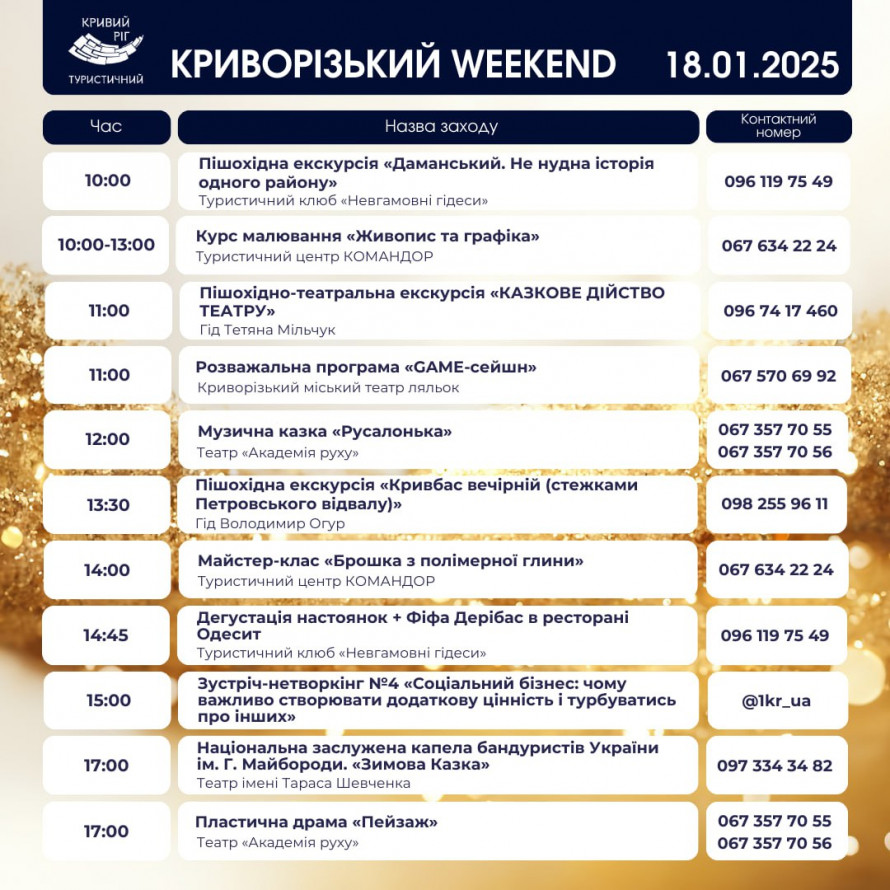 У суботу, 18 січня, розпочнеться із пішохідної екскурсії “Даманський. Не нудна історія одного району”, а для творчих натур пропонують курс “Живопис та графіка” в Туристичному центрі “Командор”. Театральні вистави, інтерактивні програми для дітей та майстер-класи (зокрема зі створення прикрас із полімерної глини) стануть чудовим варіантом для родинного відпочинку.