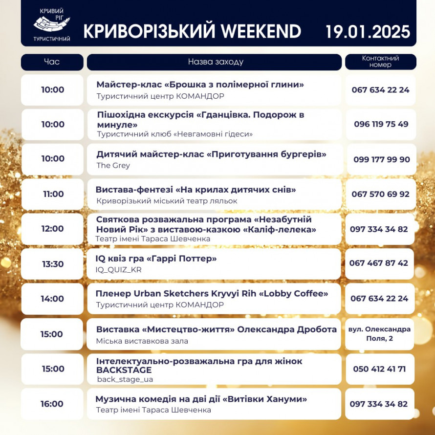 Недільна програма, 19 січня, також обіцяє не залишити байдужих. Зранку можна відвідати дитячий майстер-клас із приготування бургерів або пішохідну екскурсію “Гданцівка. Подорож у минуле”. Для любителів активного дозвілля – інтелектуальні ігри, творчі пленери та виставки. Вечір можна завершити переглядом музичної комедії “Витівки Хануми” у театрі ім. Тараса Шевченка.