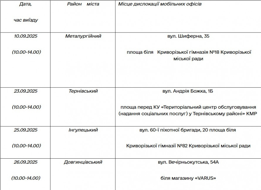 У вересні, Мобільні офіси Центру «Віза» («Центр Дії») курсуватимуть за наступним графіком, зокрема: