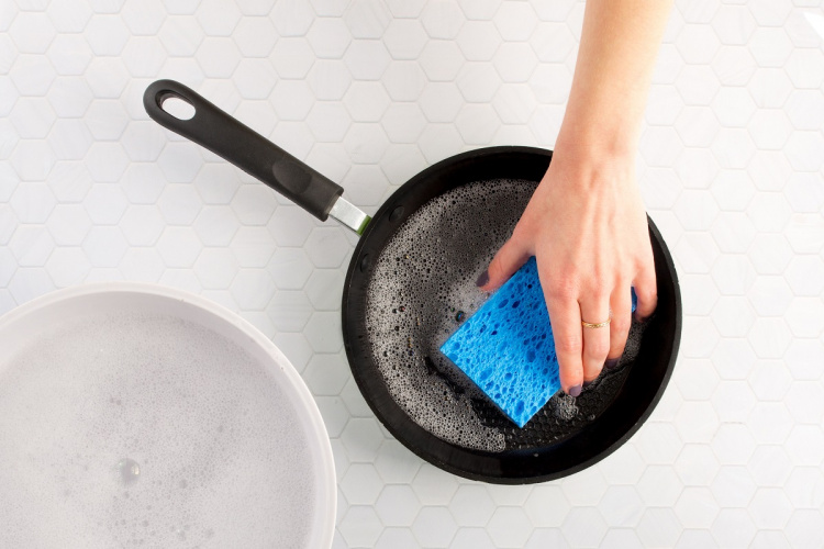 1. Змочіть сковорідку теплою водою та нанесіть трохи мийного засобу.