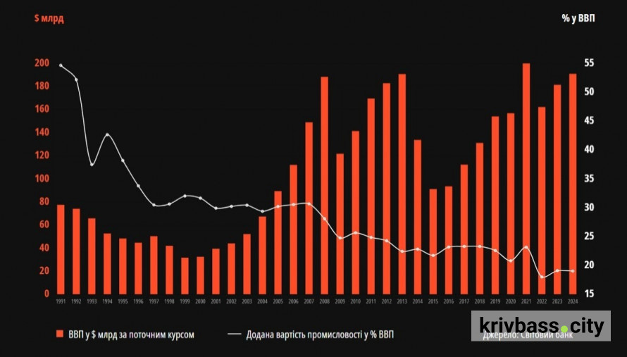 Промисловий сектор скоротився до 19% ВВП на кінець 2024 року. Це всі галузі разом – від металургії до харчової промисловості. Валютна виручка впала на 35%, податкові надходження – на 20%. Щодо важкої індустрії – її частка в загальних обсягах реалізації продукції за час війни впала з 55% до 41% (вересень 2025 року).