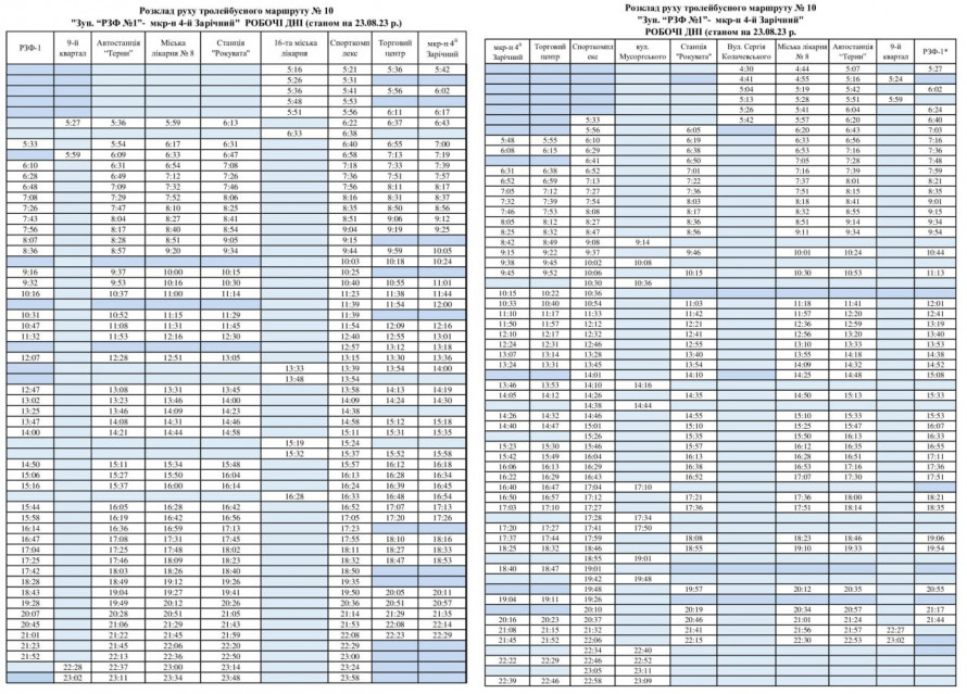 У будні дні найперший рейс тролейбуса №10 у бік РЗФ-1 вирушає від зупинки на вулиці Сергія Колачевського о 4:30 ранку. А перший рейс з мікрорайону 4-й Зарічний стартує вже о 5:48 ранку.