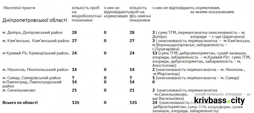 За період з 17.04.2026 по 23.04.2026 структурними підрозділами ДУ «Дніпропетровський ОЦКПХ МОЗ » на території області досліджено 135 проб питної води на відповідність до вимог Державних санітарних правил і норм «Гігієнічні вимоги до води питної, призначеної для споживання людиною» і «Показники безпечності та окремі показники якості питної води в умовах воєнного стану та надзвичайних ситуаціях іншого характеру».