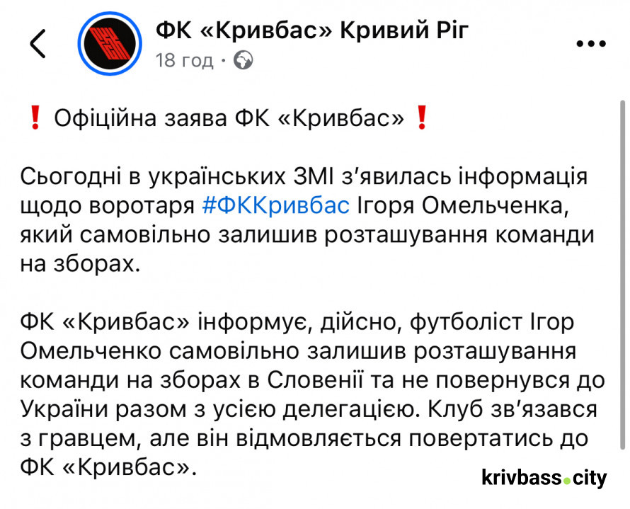 Футбольний клуб «Кривбас» сколихнув несподіваний скандал — воротар Ігор Омельченко самовільно залишив розташування команди під час закордонних зборів і не повернувся до України разом із колективом. Про це повідомили в пресслужбі клубу.